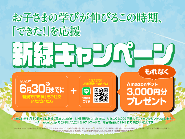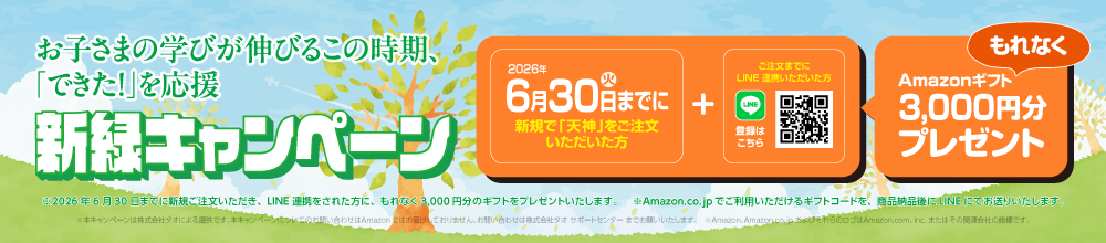 「天神」をお届けしてから90日の間に30日以上「天神」で学習していただいたお子様に、「天神」オリジナルグッズをプレゼントいたします。
