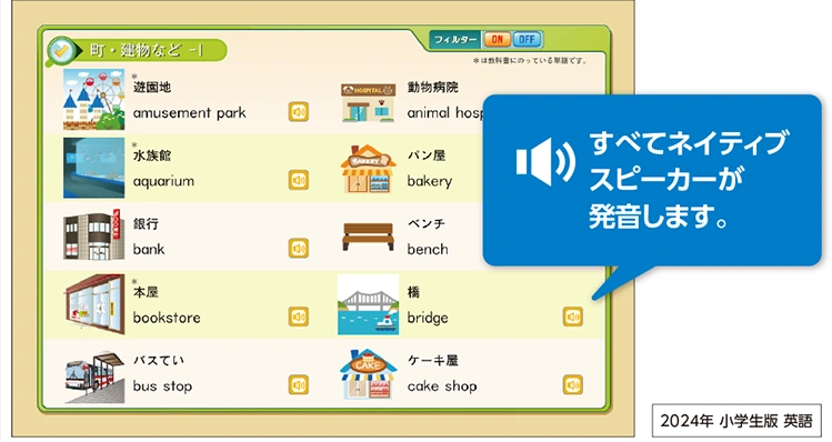 また、単語はすべてネイティブの発音で聞いていただけます。小学生では、単語のスペルを覚えて書くことは求められませんが、取り