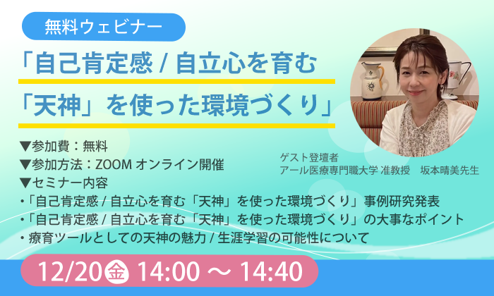 2時になりましたので、12月のセミナーを開始いたします。本日は、「自己肯定感、自立支援を含む天神を使った環境づくり」をテーマに、アール医療専門職大学の坂本先生をお迎えし、約1年間にわたる事例研究の発表や、インタビュー形式でその知見を伺います。