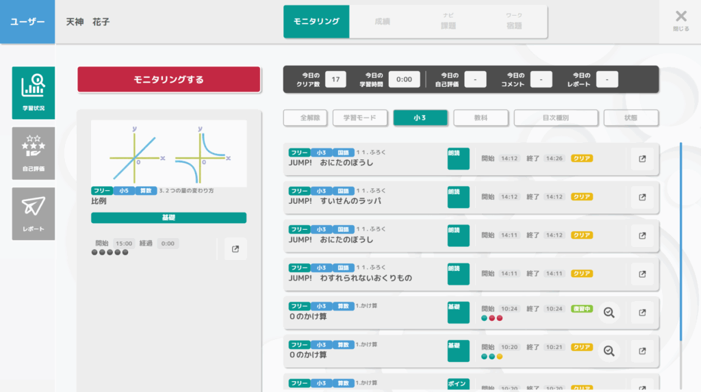 - 今日の学習記録や学習リストの残りを生徒毎に確認したい
