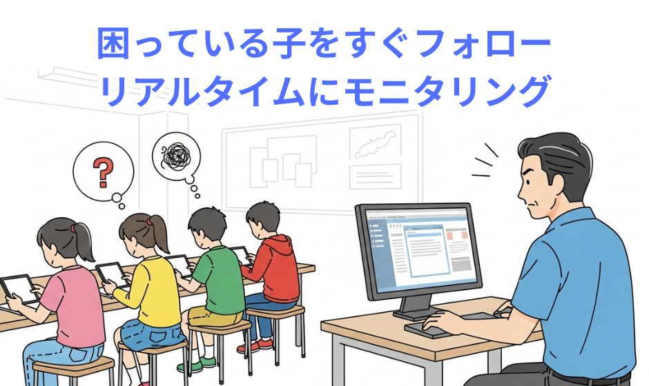 「問題が難しい」「正解したけどわかっていないかも」「質問したいけどどう聞けば良いかわからない」等の悩みを抱える児童・生徒の学習状況をリアルタイムで把握でき、生徒の質問に先んじて、より能動的且つきめ細かな声かけや学習支援を実現しやすくなります。
