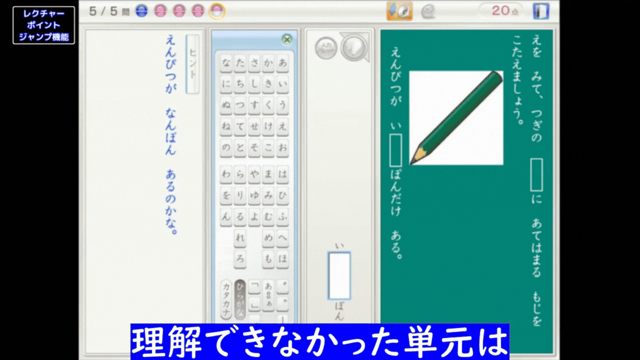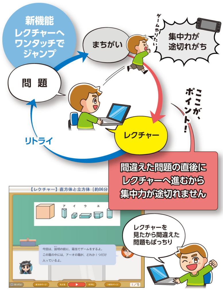 問題目次で一定の点数に達しなかったとき、これまでの選択肢「前のレベル」「同じ目次」に加え、「レクチャーを見る」ボタンが選べるようになります。ボタンを押すだけで、つまずいた単元のレクチャーへ直接ジャンプ!